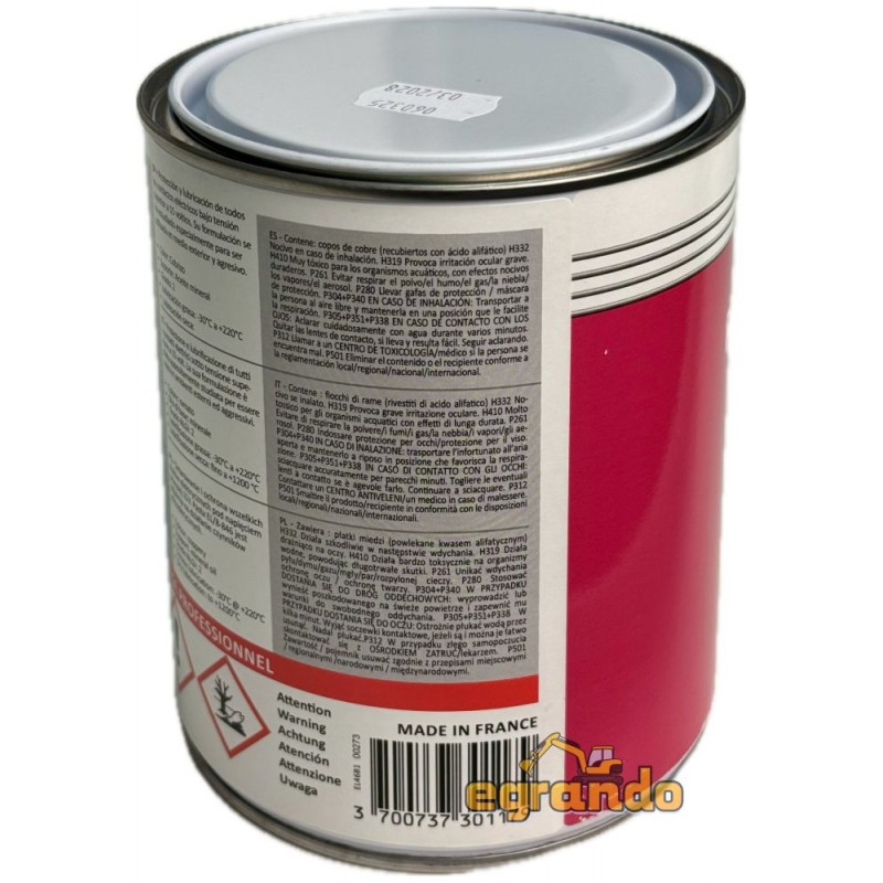 Pasta jest odporna na skrajne temperatury – od -35°C do +250°C w smarowaniu tłustym oraz do +1200°C w smarowaniu suchym. Dodatek miedzi, grafitu i dwusiarczku molibdenu (MoS₂) zapewnia wyjątkową trwałość warstwy smarnej i stabilność parametrów w trudnych warunkach pracy.